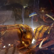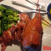 And we practically never did! But we got hungry, so we sauntered next-door to Red Lobster, which cooks up a pretty good crustacean. It’s pretty awful to look at the poor lobsters being tortured with rubber-band-bound claws trapped in a tank. But my hunger and desire for the luscious texture and savory flavor overcame my disgust with seeing dinner displayed like it’s on Death Row. I also have a sentimental feelings for lobster, as whenever my Dad wanted to romance my Mom, that’s what he’d take her out to eat, so unless it’s really badly prepared (which this wasn’t), I love it. The Sangria was also scrumptious, with a strawberry (probably genetically engineered, and definitely yummy) the size of my fist perched on the side of the glass.