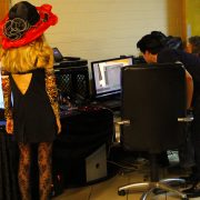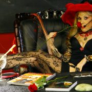 Shannon sits on the couch with my kitty cat show assistant Blossom Green, also looking quite sexy in a bright red halter top that matches my red hat and roses, though as the show flows on, both get up and share my giant leather queen’s chair (an 11th wedding anniversary gift!), which can fit two, but not quite three, and Max makes four.