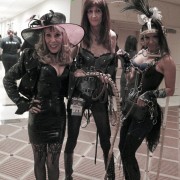 The morning of my talk found my bleary-eyed Bonoboville team attempting to explain who we were to a very nice, yet harried and understandably confused volunteer DomCon receptionist, as a long and winding line of heavily corseted humans waited somewhat impatiently behind us. At least I felt chic cooling my peep-toe red-bottom heels in my elegant Abigail Greydanus shiny black latex halter dress, topped off by a vintage Dream Dresser black patent jacket with red accents and, of course, a big hat. But what to do? We couldn’t hang around the reception line all day, at least not at the front of it.
