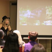 We didn’t have much time before the talk to set up our film projector, video, PA and recording systems. One recorder went into the back of my dress, sticking to my spine thanks to the latex, making me part robot, in addition to part bonobo.