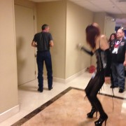 Interestingly, this Red Carpet didn’t have the typical logo background, just a plain white wall punctuated by the men’s and women’s rooms. Could it be that the Hilton was game to host DomCon, but drew the line at posting branding that involved actual (human flesh) branding, not to mention whips and chains, on its plain white Middle American walls?