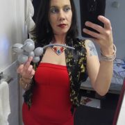 Well, she pulls up her dress to reveal her partially shaved vulva.
