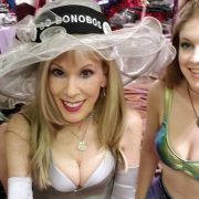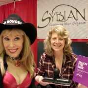 But time was ticking away, so rather than spark a doobie, Phoenix and I elevatored down to obtain our credentials, then strolled through the Marketplace where we chatted with Sybian owner Bunny Lambert, whose father invented the marvelous machine that has brought Bonoboville so many hundreds of orgasms—and that doesn’t count the hundreds of thousands of voyeur-gasms experienced by those watching the lucky cowgirls (and a few cowboys) ride the vibrating bronco on DrSuzy.Tv.