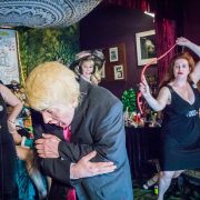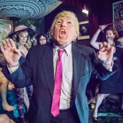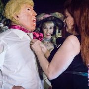 What do we punish him for? Oh, let me count the foibles… The mess America—and most of human civilization—is in is due to many factors, including a nasty mix of plutocrats, jacked up police, perma wars and corporate machines, with tRUMP as the figurehead, the very worst symptom of the capitalist disease. We punish him for his extreme greed, narcissism, racism, sexism and epic insensitivity. On the day of this show, a fire broke out in Trump Tower (was Don, Jr. burning evidence or did it emerge from Senior’s pants?), and the Trumpus tweets that all is well, bragging about his “well-built building.” Moments later, we learn that someone died in that fire.