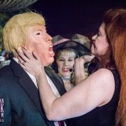 Our punishing of tRUMP crescendos as he strips off his suit and shows his shortcomings to jeers from the crowd. He lies down compliantly on the tarp, and then all the FemDoms—and a few of the porn stars—proceed to shower him with golden sprinkles galore. It’s another Russian Hooker Pee Party! Rhiannon goes first, scoring a bullseye in the Presidential bellybutton, and the rest of us follow, putting him through the proverbial urinary car wash, until he’s gleaming gold as Trump Tower (isn’t urine a disinfectant?).