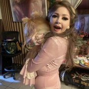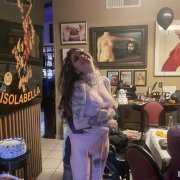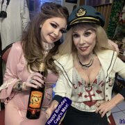 First up for Max’s birthday spanking was the fabulous Amor Hilton (no relation to Paris) who appeared to be in her birthday suit—at least from the waist down, her pale pink thong teddy matching her pale pink skin. Such a living Barbie Doll, with a purse made of white latex skeletons, it’s no wonder Amor wins the “Most Adorable” Suzy Award every year.