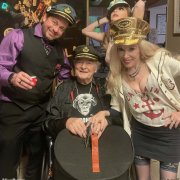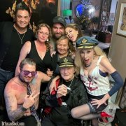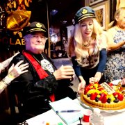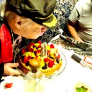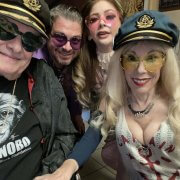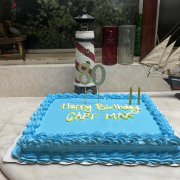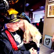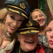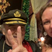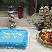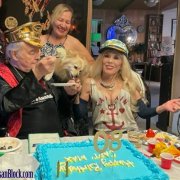 As for cuisine, the hit of the party was Ana’s fresh, mouth-watering taquitos. My hairdresser Mark Brown brought more yummy appetizers, along with his professionally coiffed shiatzu-poodle Frankie. Dragon Steel’s giant ocean blue cake and twin captain’s hats (one enormous gold headpiece and another in Hawaiian-style floral green) made fun party favors, and Miguel, Mar, Dre, JD and Rodrigo (our multi-talented DJ photographer) rounded out the cast of characters, all of us surrounding Capt’n Max with the love and appreciation he deserves for making it to 80 with style and passion.
