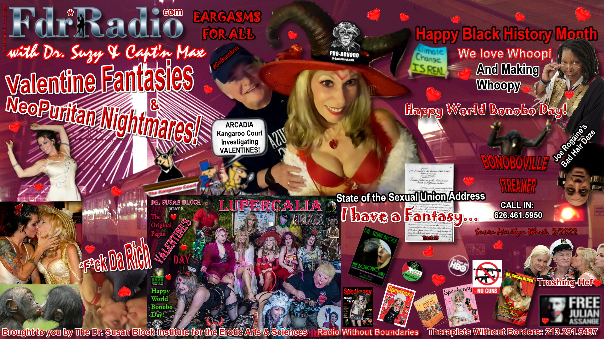 But there’s always something to enjoy on F.D.R. We’re still celebrating Chinese New Year, aka Lunar Nude Rear (Mooning the Moon Over the Moon), and it’s Black History Month (hail the great Grace Jones!). It’s also Valentine Season, so we get set for the big V-Day, Lupercalia (the original pagan Valentine’s Day) and World Bonobo Day honoring the Make-Love-Not-War Chimpanzees, aka the Horniest Apes on Earth, who show us The Way to Peace through Pleasure.