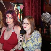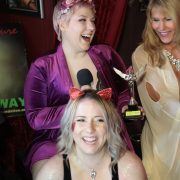 Blossom Kitty balances a SUZY award on her head between her kitty ears as Goddess Phoenix shows off her “Goddess Experience” toga/robe that she designed herself, and I congratulate tonight’s bevy of 2018 SUZY winners. Photo: Frank H