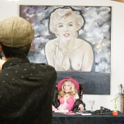 We don’t exactly have a set yet, but we do have our giant topless Marilyn painting by the amazing Mark Christian (who only paints Marilyn and always while drunk) right behind me. Sad how this angelic creature who made so many people feel good led such a tortured life, dying so young and mysteriously. Marilyn being my middle name, it feels good to have her behind me, or hovering above me, watching over me from icon heaven. She used to hang in my private office, but now I’m delighted to share her with you.