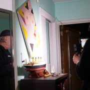 The first thing we encounter is the “wall” Max created of three racks of my clothes smothered in Saran wrap and looking very uncomfortable (for clothes), like they’re about to burst through the plastic and join us. Actually (are the edibles kicking in?), they look like an abstract painting of the immigrant families applying for asylum locked outside in the cold, thanks to Trump’s heartless policies.