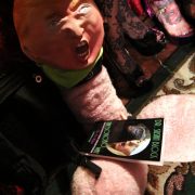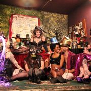 Madame Margherite and her “Monkey,” Andres Rey Solorzano, are here although for NYE, Andres is more man than monkey, and the two of them share a delectable kiss at midnight. So do my ravishing assistant, Gypsy Bonobo, looking especially festive in 1940s-style pincurls and a black corset, and Paniscus Brecht, who also looks ravishing in Misfits skull top and skyscraper heels. I too share a little midnight (well, close to midnight) kiss with my one and only beloved primemate, Capt’n Max.